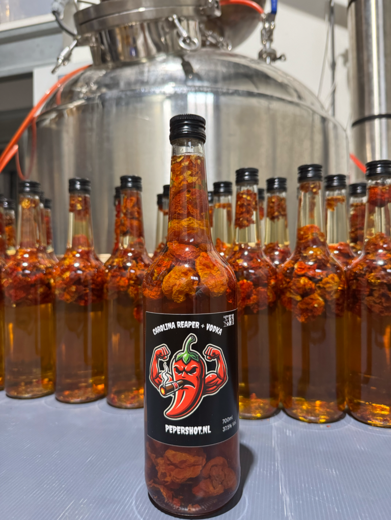 Pepershot wordt zorgvuldig geproduceerd door de Kleine Distilleerderij in Zeewolde. Pepershot is Vodka met daarin gedroogde Carolina Reaper pepers die geïmporteerd zijn uit Ecuador. De Vodka neemt langzaam de werkzame stof van de pepers (Capsaïcine) op, dit resulteert in een intense licht rokerige en EXTREEM pittige smaakbeleving.